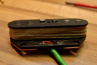 The bridge pickup was wound with 8500 turns of 42 gauge wire, and the bridge was reverse-wound with around 6500 turns of 43 gauge, and of course reverse polarity for the magnets. Once wound, the pickups are wrapped with string to protect the delicate coil, and then dipped in wax to stop microphonics. The whole thing is very solid, and rather heavy.