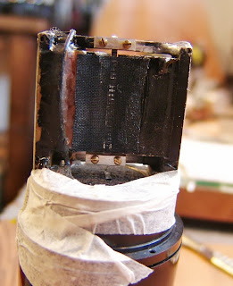 The motor is simply made of two magnets screwed and welded to a metal frame, and the ribbon itself is about 2.1 mm wide. This one needed some welding and a new ribbon, but once repaired sounds nicely balanced for a vintage ribbon, with the transformer rolling off some of the bottom end to compensate for the proximity effect.