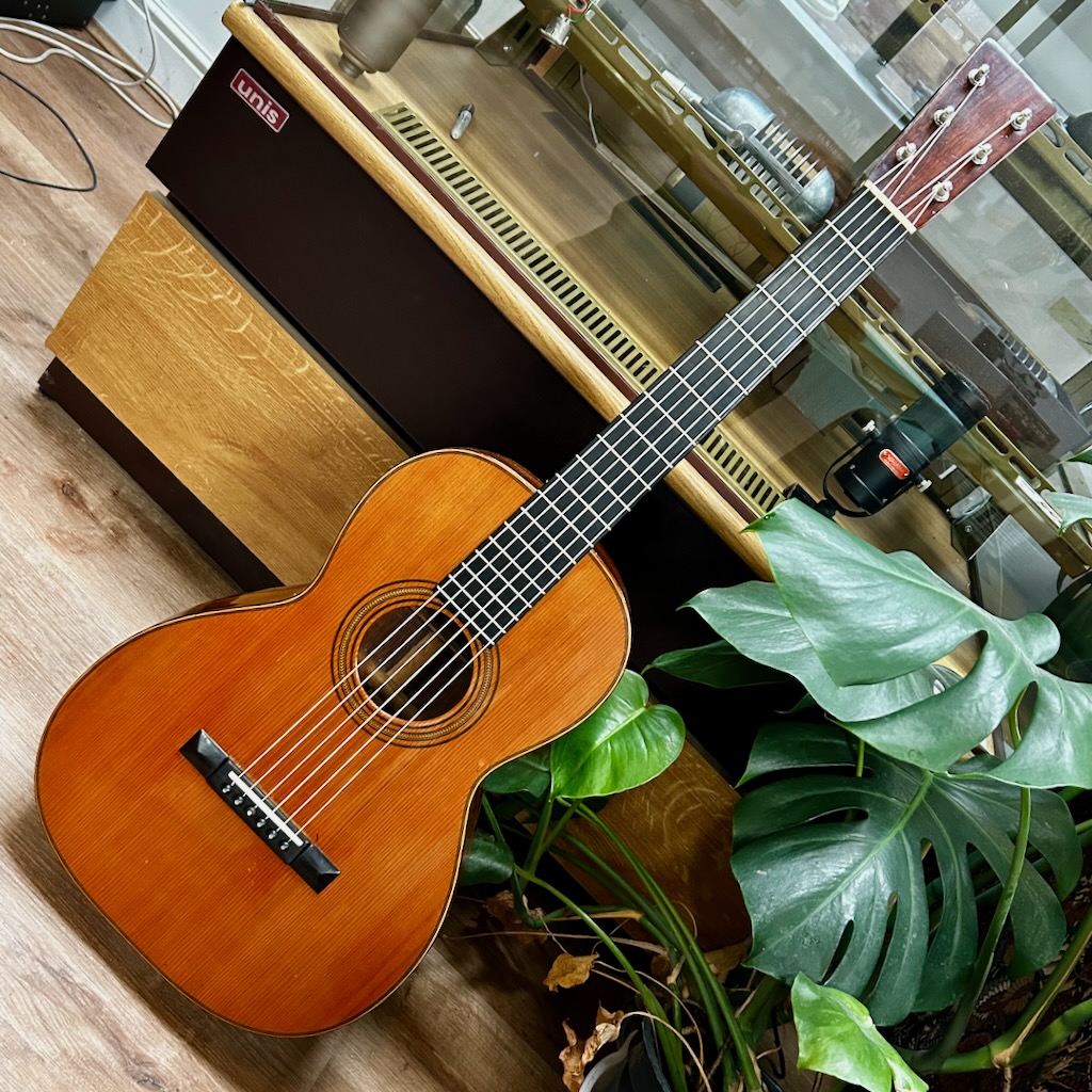 We recently made some recordings of some of our oldest microphones, tracking a 125 year-old Martin 0-18 acoustic guitar. The guitar is very special – it was build in 1900 before Martin began selling guitars with steel strings*, and has a very lightly-built Adirondack spruce top and rosewood back and sides. It would have originally been fitted with gut strings and now has a set of Aquila 900 nylon replica gut and silk. I love the warm tone of this elderly little guitar.