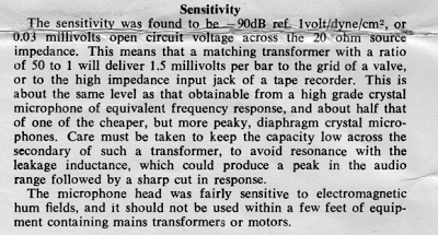 Although the catalog mentions 20 ohm and 500 ohm models, I have also seen high impedance models of this mic. The frequency response is claimed to be “substantially maintained to 14000 Hz”. From experience, I would say that ‘substantially’ is used loosely. The BBC have a bit more to say about this mic in their R&D reports.