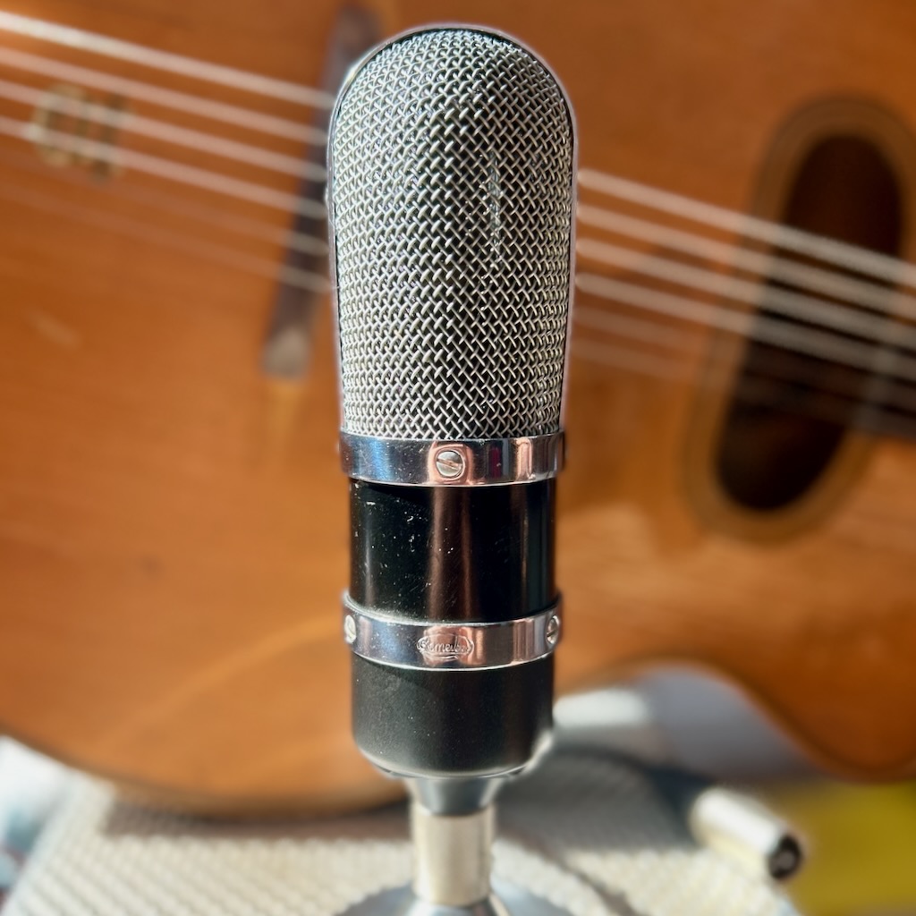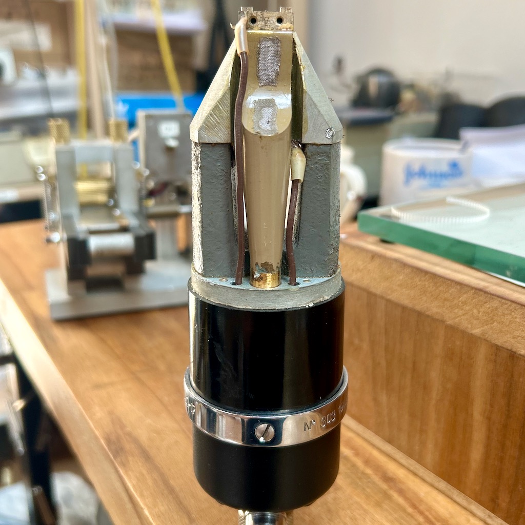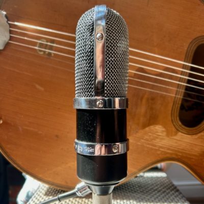 The grill cloths have been replaced and the bottom bell has been re-finished. There are some scratches on the middle section of the microphone which houses the acoustic labyrinth. It fits onto a modern 5/8″ microphone stand.